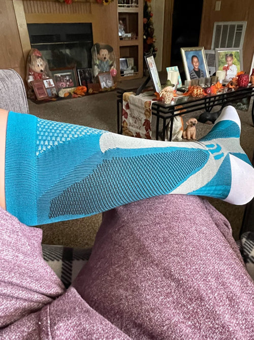 "Before I got these socks, my legs would swell and ache by the end of the day, especially during my pregnancy. Now, I feel more energized and comfortable, even after standing or running errands for hours! These socks have been a lifesaver, and I’m so glad I found them."